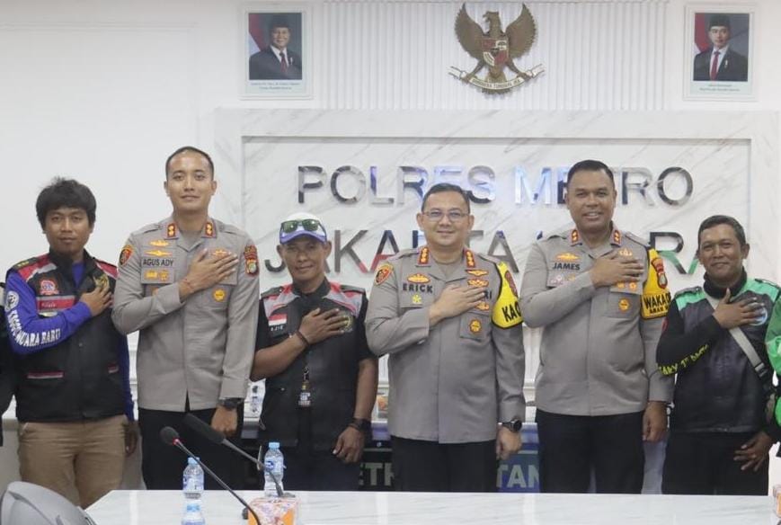 Kapolres Metro Jakarta Utara, Kombes Pol Erick Frendriz, S.I.K., M.Si., memimpin pengukuhan Presidium Komunitas Ojek Online se-Jakarta Utara dalam rangka mendukung program Jaga Lingkungan dan Jaga Warga.