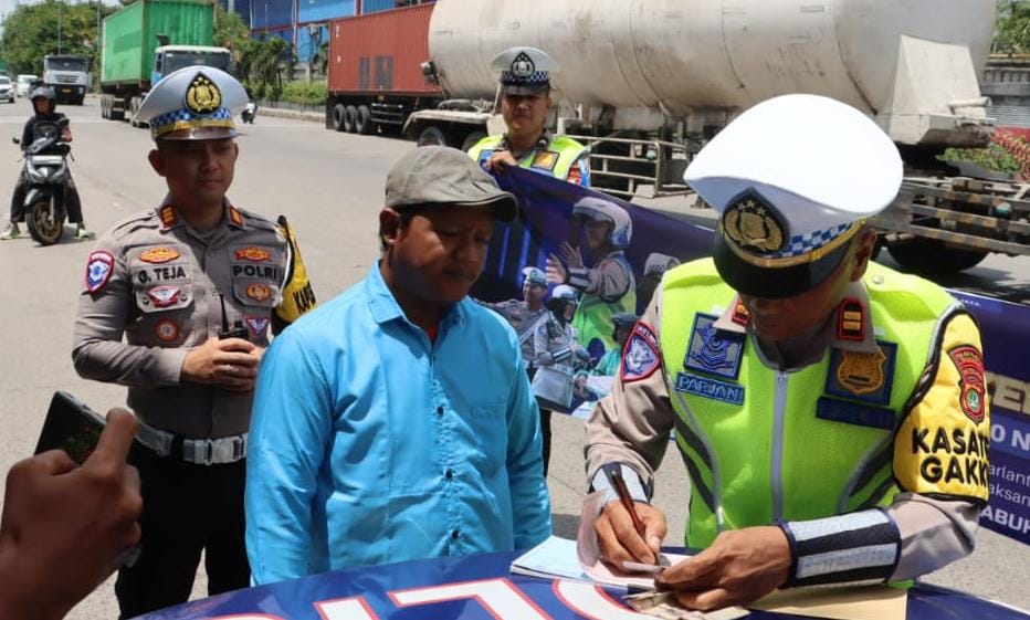 Satlantas Polres Pelabuhan Tanjung Priok melakukan pengawasan dan penindakan terhadap pelanggar lalu lintas dalam rangkaian Operasi Zebra Jaya 2025, Senin (17/11/2025).