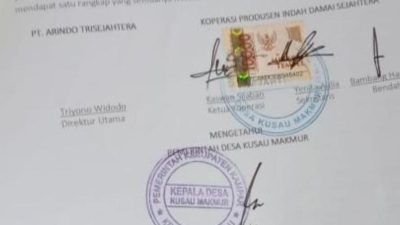 Masyarakat sangat Kecewa dengan perlakuan Pj Kades Kusau Makmur Jaka, yang menandatangani surat perjanjian kerjasama PT Arindo Trisejahtera dengan Koperasi Produsen Indah Damai Sejahtera No : 66/FKMS/ATS/LGL-PKU/VI/2025,tanpa Musyawarah Desa. Kamis,b(16/10/2025).