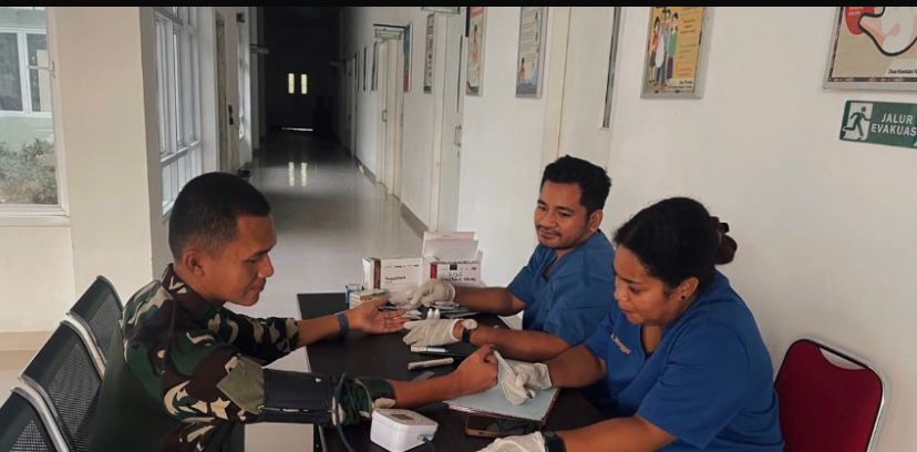 Pengecekan kesehatan menyeluruh olah puskesmas yembun memastikan setiap personil satgas berada dalam kondisi terbaik dari tensi hingga fisik semua demi menjamin kesiapan operasional 100%.